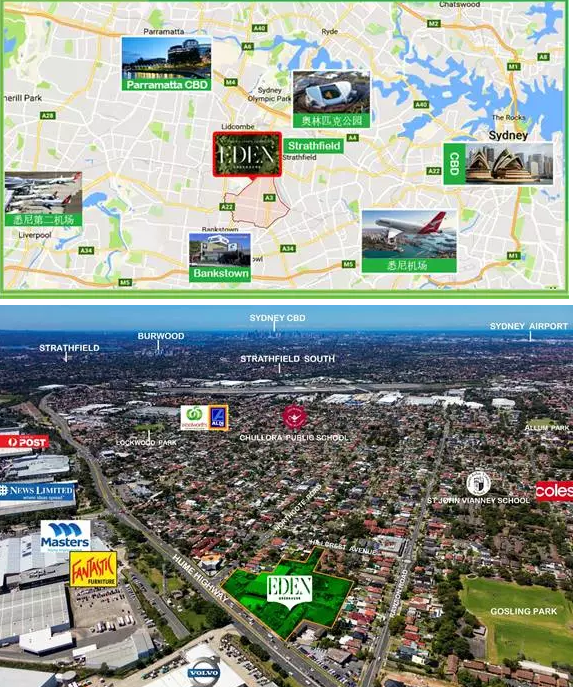 Eden位于距离悉尼市中心17km处,距离奥林匹克公5km, SydneyAirport 13km,紧邻Strathfield和Bankstown,地理位置四通八达且便于到达悉尼东西南北各处.
