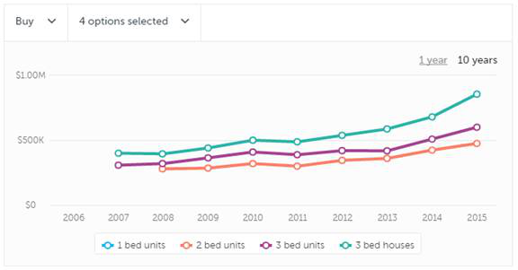(悉尼十年两房公寓走势图)
